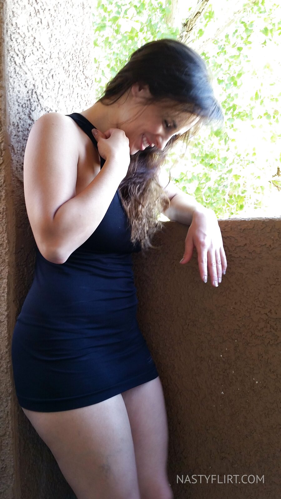 Une brunette sulfureuse soulève sa robe moulante pour exhiber ses fesses dans un string sexy. Ses énormes nichons naturels ne laisseront personne indifférents. Des clichés excitants à ne pas manquer.