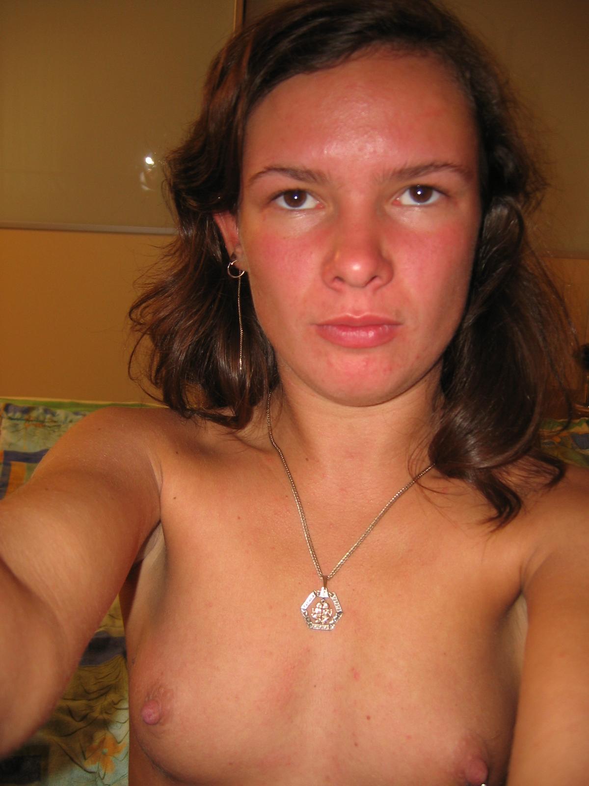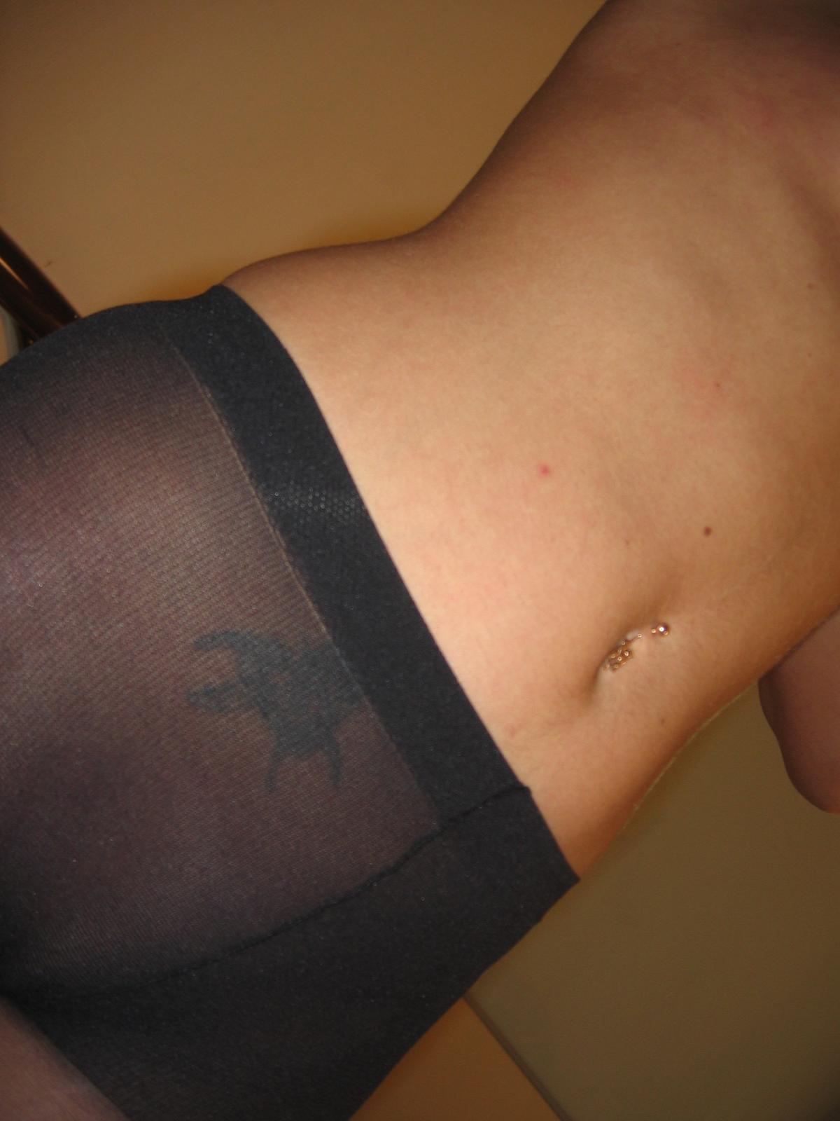 Jeune femme de 19 ans, seins nus, en bas noirs transparents, exhibant sa féminité et sa sensualité dans une pose suggestive.