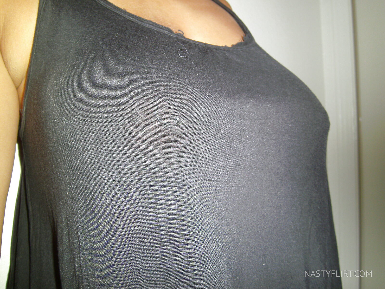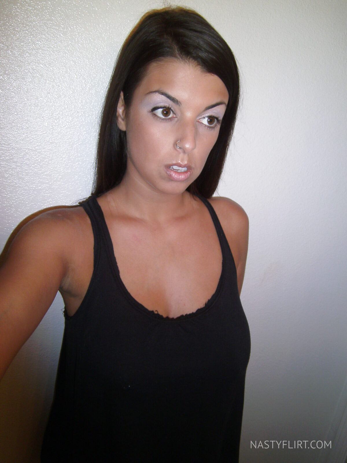 Brune aux gros seins percés et à la chatte visible sous son string bleu ciel s'exhibe en selfie torride. Une amatrice qui sait comment exciter ses followers avec ses formes généreuses.