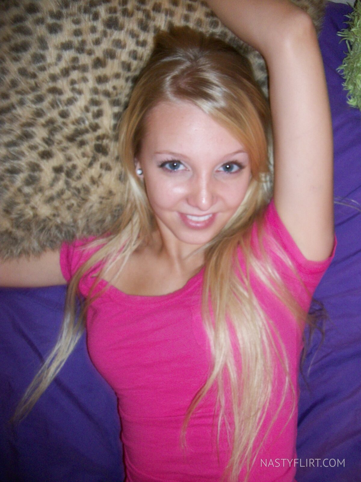 19-year-old superbe blonde aux yeux bleus exhibant ses seins parfaits et gardant sa culotte sexy rose et noire. Une séance de teasing sensuelle à ne pas manquer.